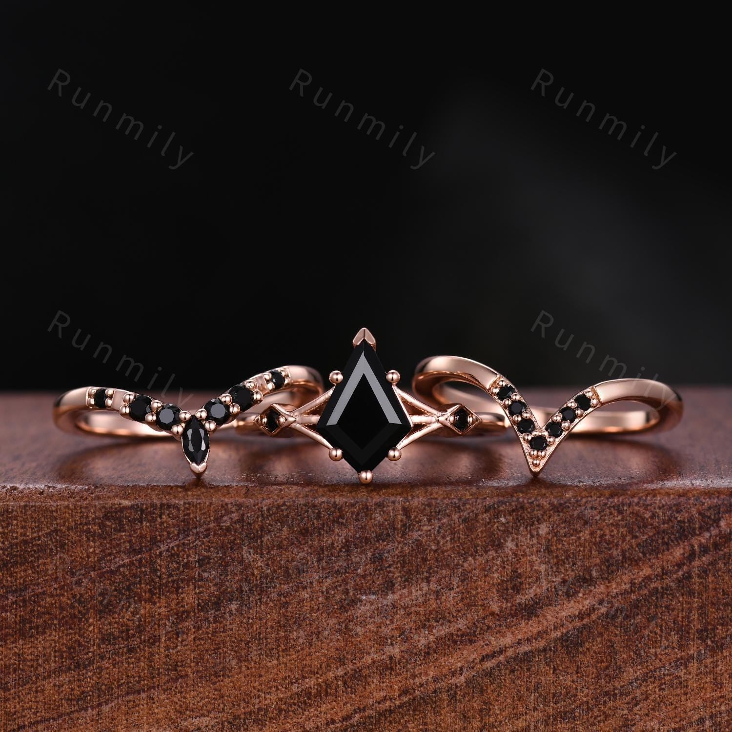 Here we have a 3PCS kite cut black onyx engagement ring set rose gold black spinel stacking band unique curved matching rings wedding bridal ring set women.