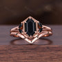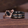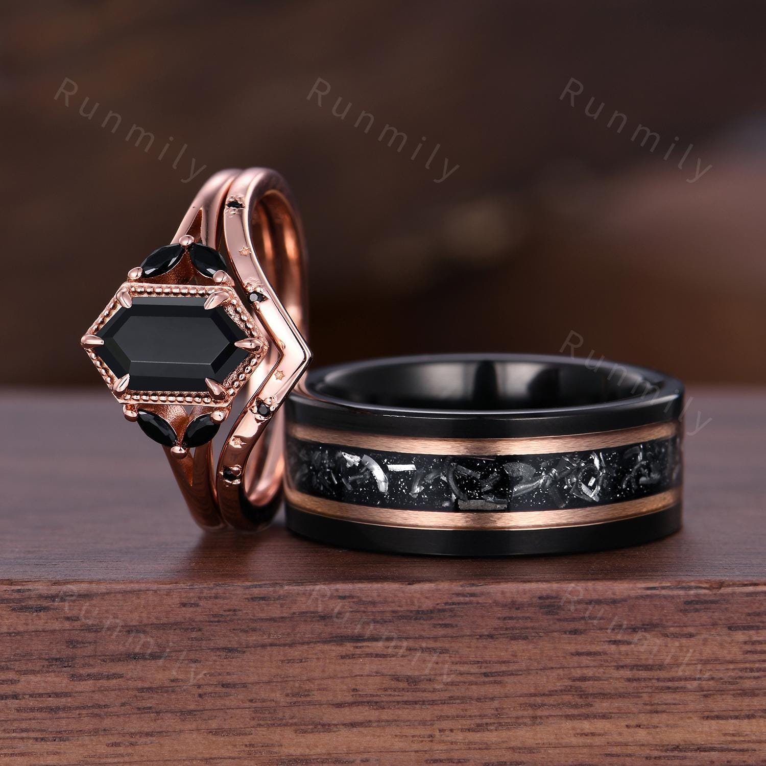 Here we have a Art Deco Black Onyx Ring Set For Couples Rose Gold His and Hers Promise Ring Mens Meteorite Tungsten Band Black Gem Bridal Wedding Ring Set.