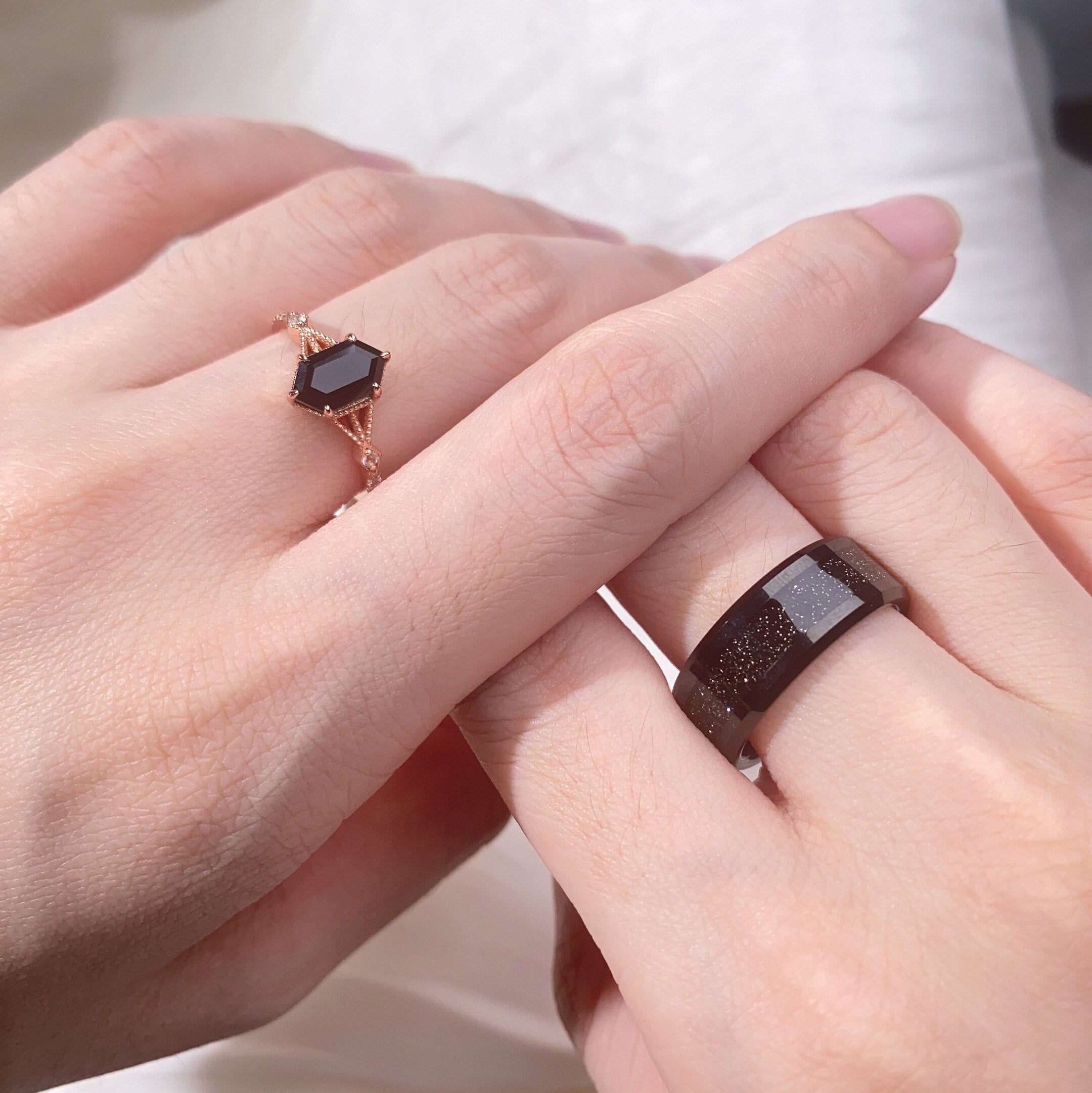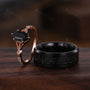 Black Onyx Ring Set, His and Hers Wedding Band, Black Sandstone Mens Ring, Rose Gold and Tungsten Ring, Black Gemstone Couples Ring