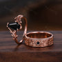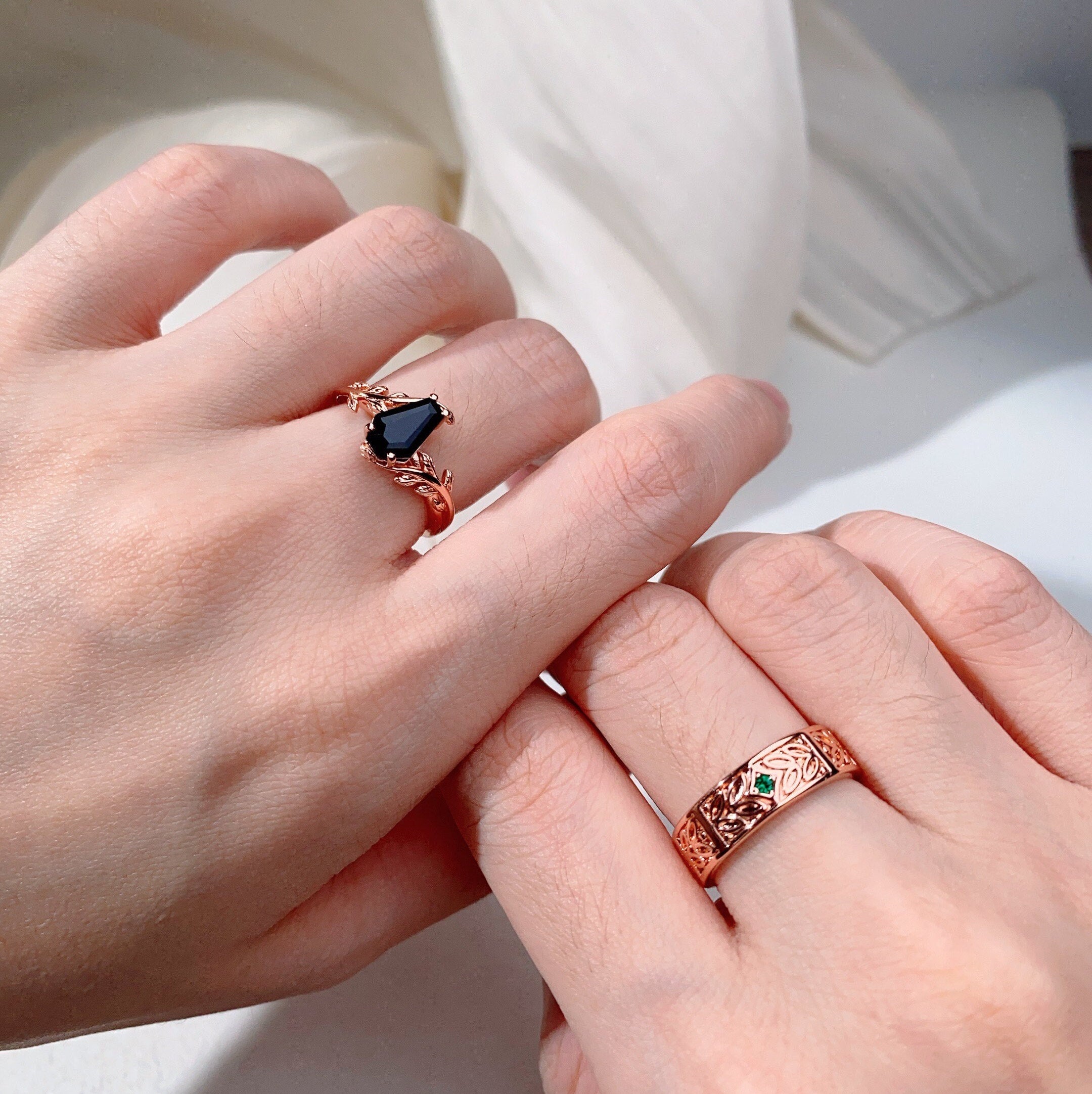 Here we have a Coffin Cut Black Onyx Couples Ring Vintage Rose Gold Matching Ring Set Twig Leaf His and Hers Wedding Band Mens Onyx Ring Black Gem Ring