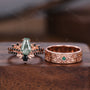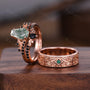 Here we have a Coffin Cut Natural Moss Agate Couples Ring Rose Gold Moss Agate and Emerald Wedding Ring Set Vintage Unique Vine Leaf Matching Promise Ring