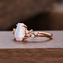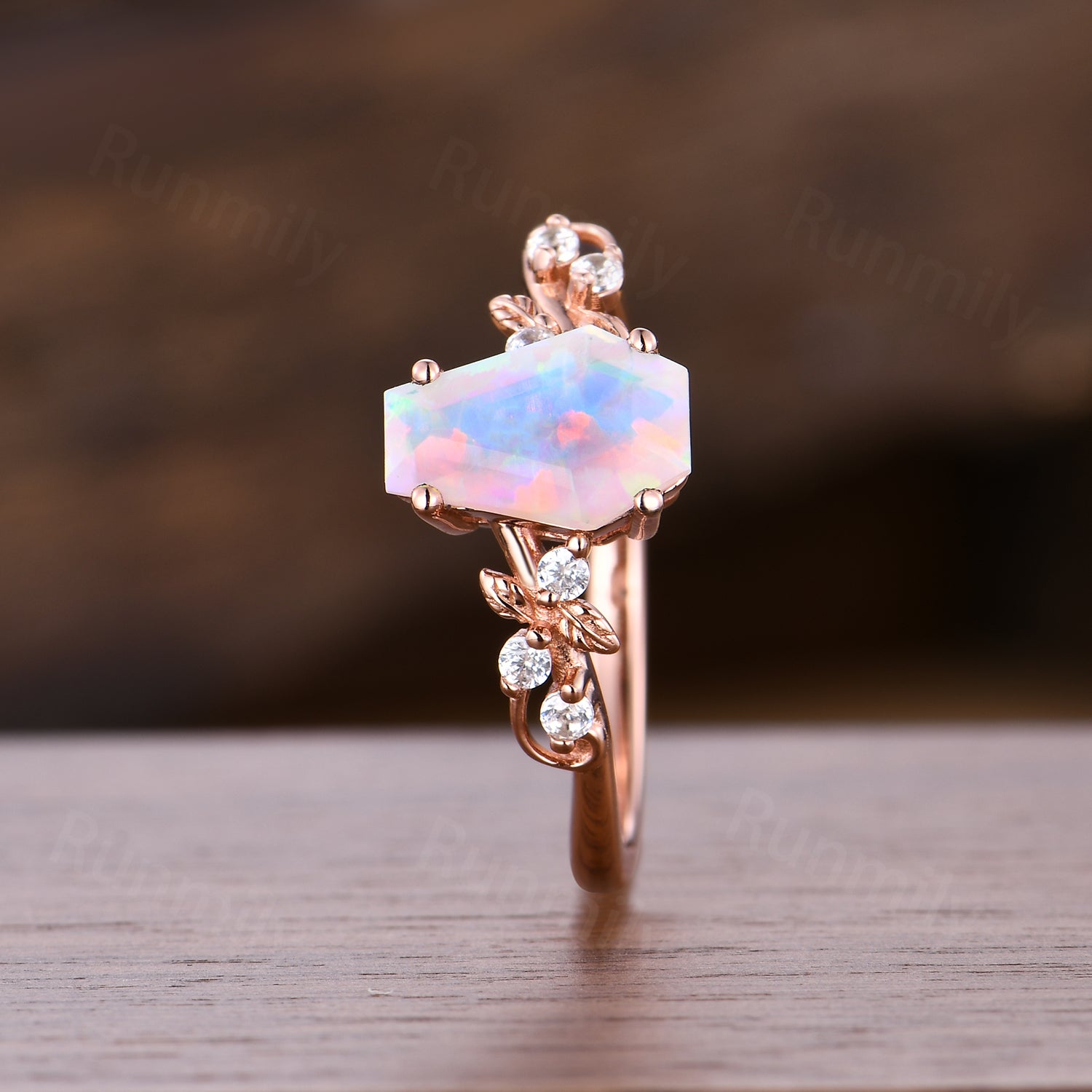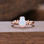 Coffin Cut Opal Engagement Ring, 14k Rose Gold Twig Leaf Moissanite Ring