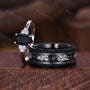 ►His ring is Black Gold Tungsten Carbide with meteorite and leaf inlay.