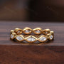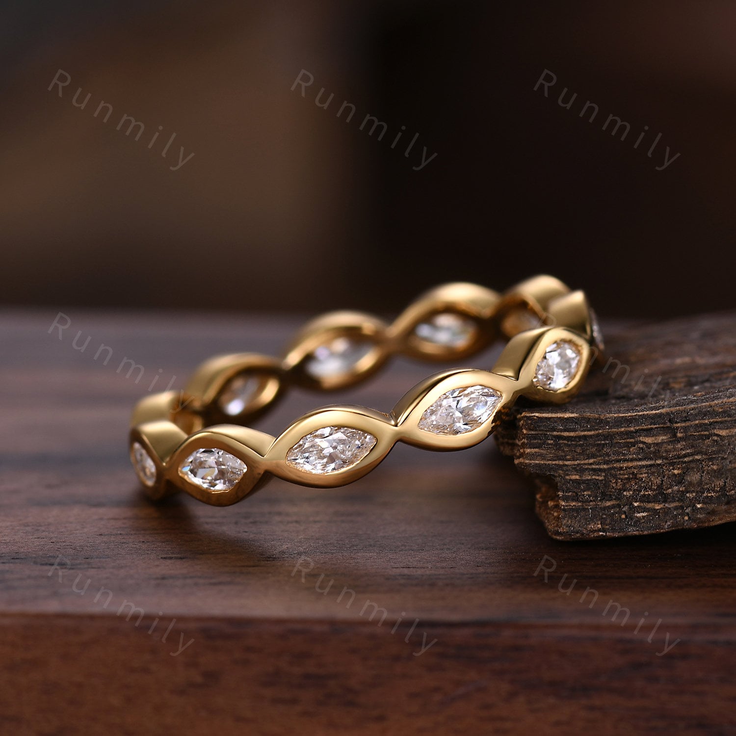 Here we have a Delicate marquise cut moissanite wedding band yellow gold eternity band vintage bezel set band unique stacking band anniversary ring