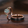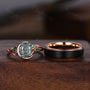 Here we have a Green Moss Agate Ring Set, His and Hers Wedding Band, Rose Gold Matching Ring Set, Vintage Moon Engagement Ring, Nature Leaf Style Couples Ring, Green Agate.