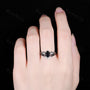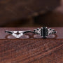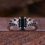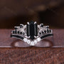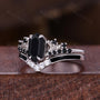Here we have a Hexagon cut Black Onyx Engagement ring set Vintage black enamel wedding band Sterling Silver Branch leaf Bridal set Anniversary ring gift.
