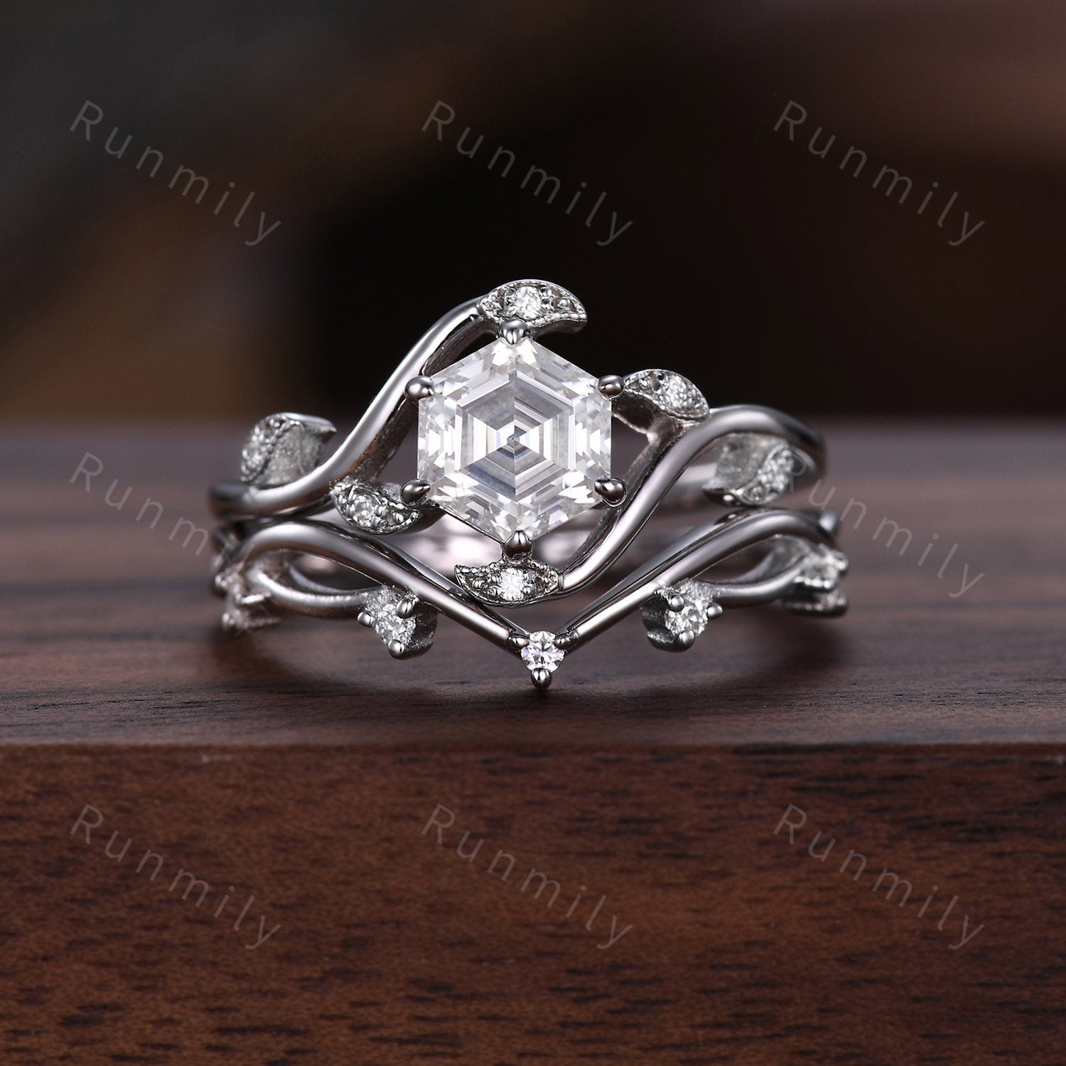 Hexagon Moissanite Ring Set For Couples His and Hers Wedding Band Sterling Silver Unique Ring Mens Tungsten Wedding Band Nature Inpired Ring