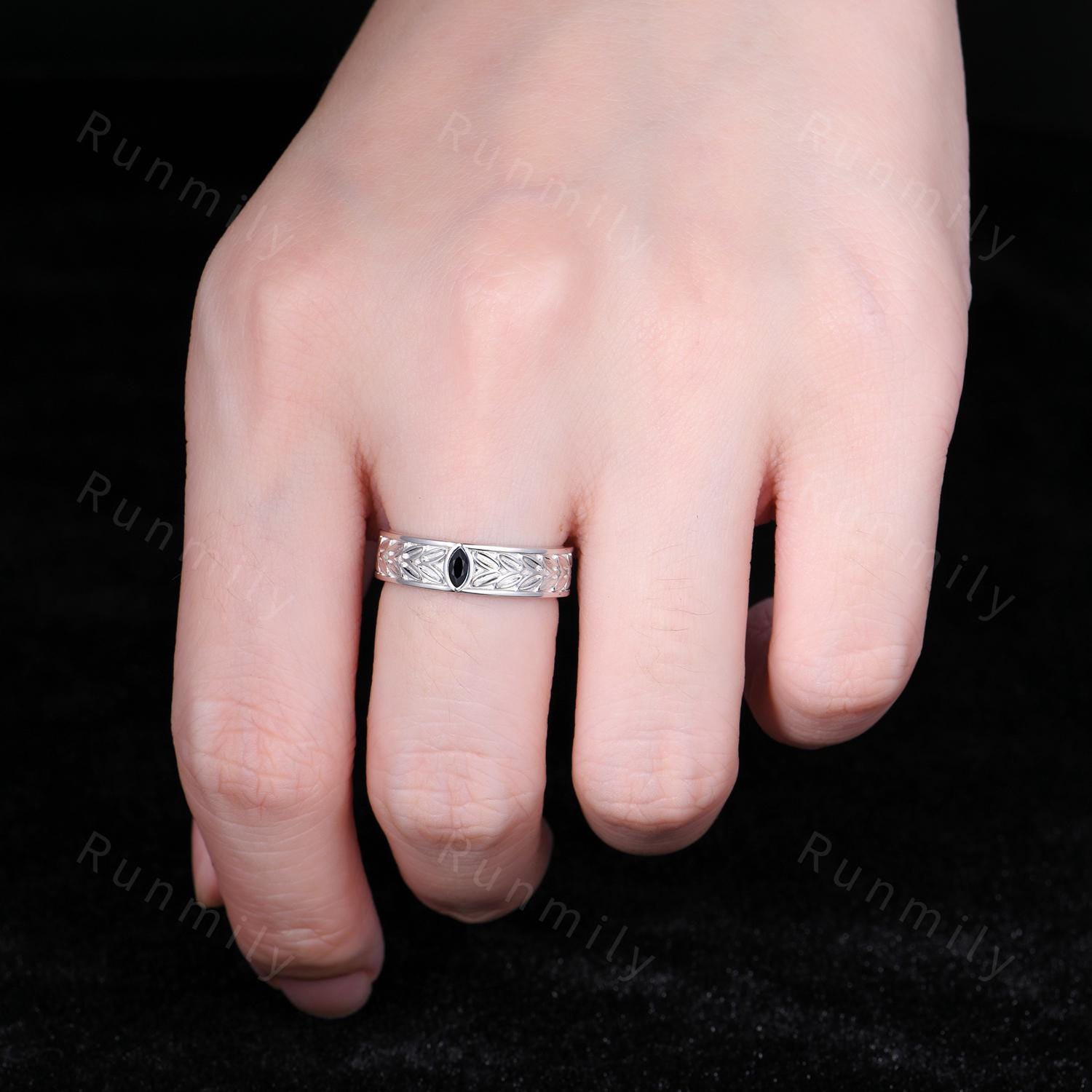 Mens Black Onyx Wedding Band Unique Marquise cut Wedding Band For Mens Natural Gemstone Ring His Engagement Ring Band Leaf-Inspired Ring
