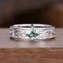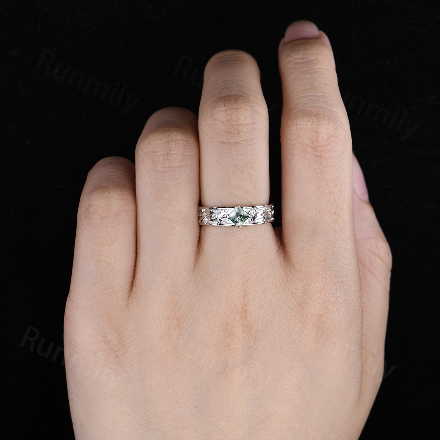 Mens Natural Moss Agate Wedding Band Silver Princess Cut Ring Nature Inspired Moissanite Band Vintage Ring For Husband/Father