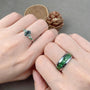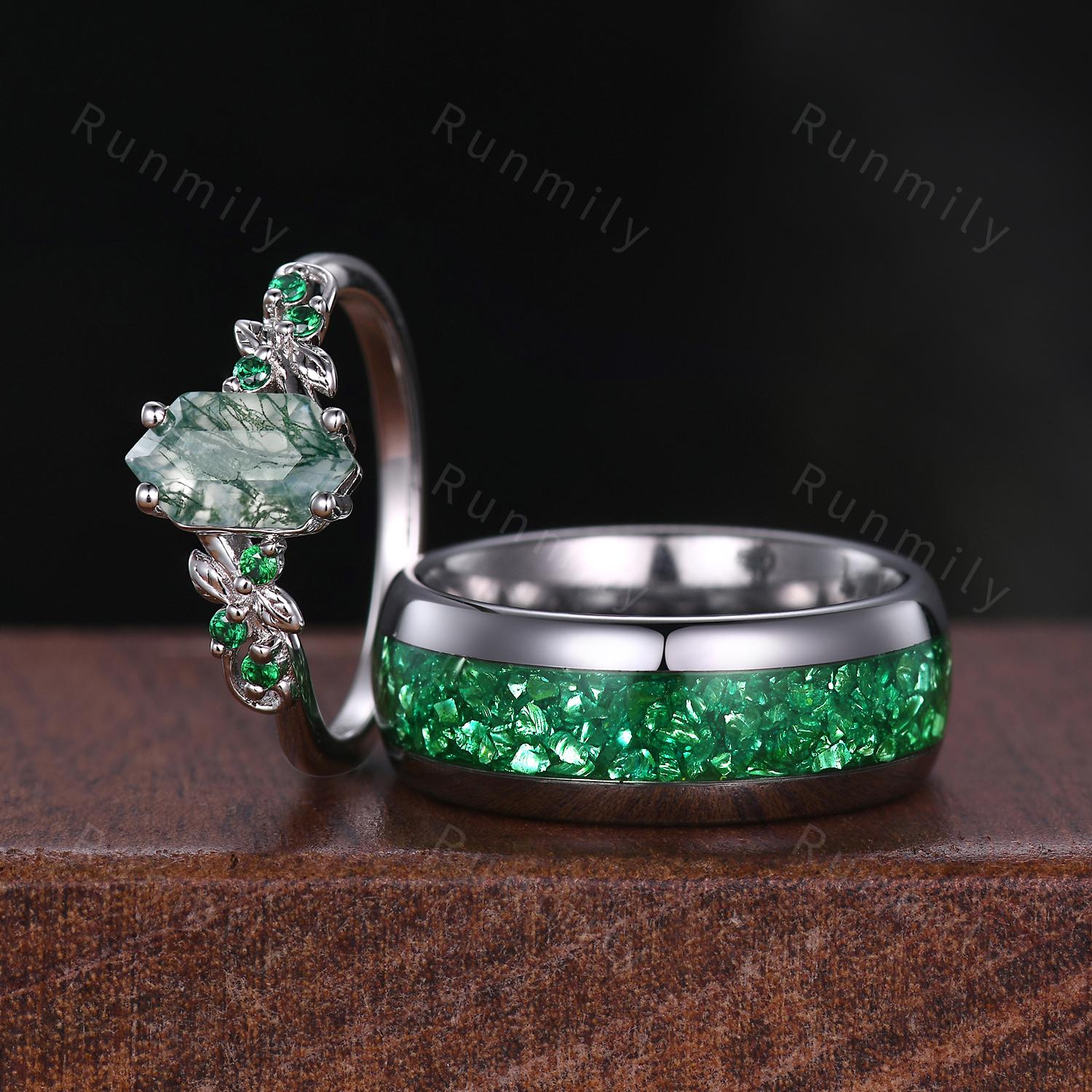 Moss Agate & Emerald Couples Ring Vintage Matching Promise Ring Set Silver His and Hers Wedding Band Mens Crushed Emerald Ring Green Rings