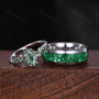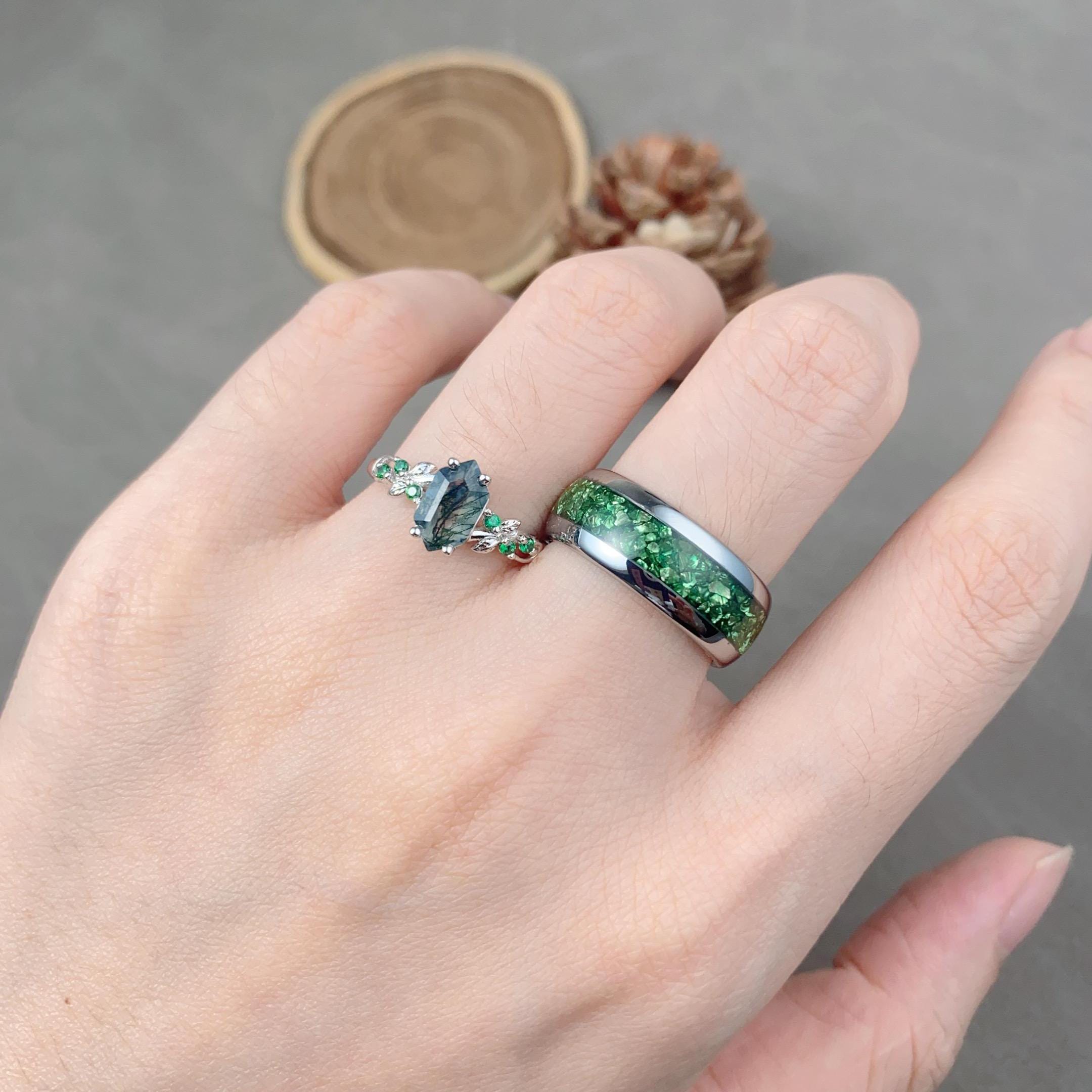 Here we have a Moss Agate & Emerald Couples Ring Vintage Matching Promise Ring Set Silver His and Hers Wedding Band Mens Crushed Emerald Ring Green Rings