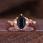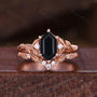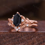 Nature Inspired Black Onyx Engagement ring set Vintage curved stacking wedding band Rose gold leaf style Bridal set Anniversary ring gifts