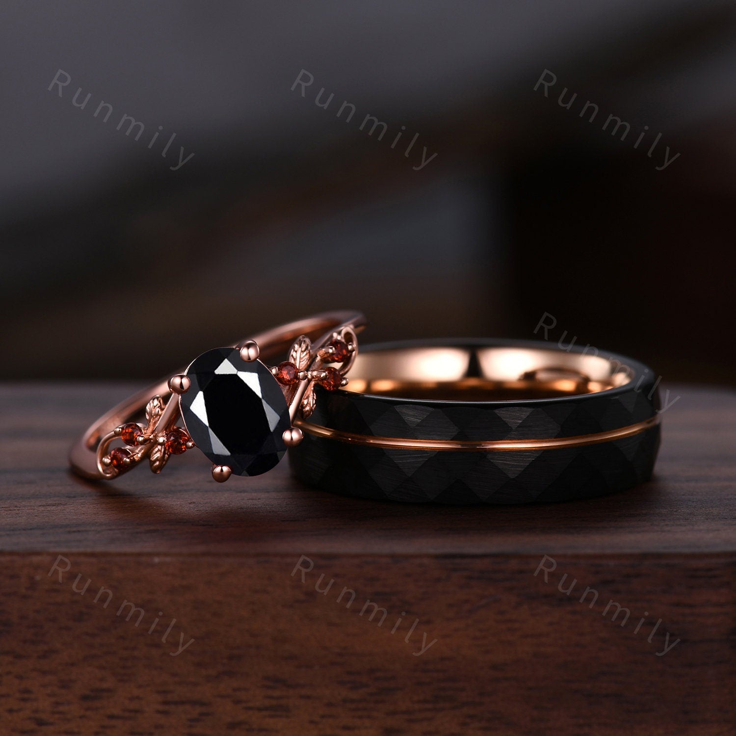 Oval Black Onyx Engagement Ring Set Rose Gold Couples Ring Mens 6mm Tungsten Wedding Band Natural Inspired Matching Promise Ring For Couples