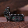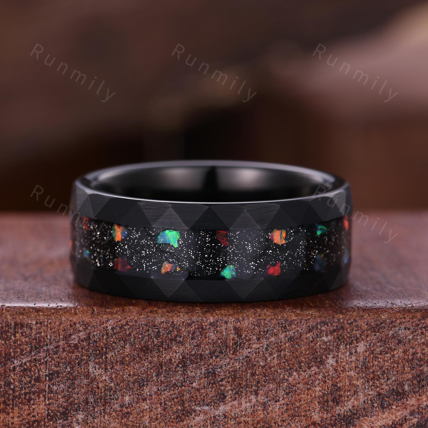 ►His ring is Black Gold Tungsten Carbide with galaxy sandstone and fire opal inlay.