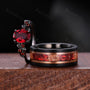 ►His ring is Black Tungsten Carbide with rose gold leaf and ruby inlay.
