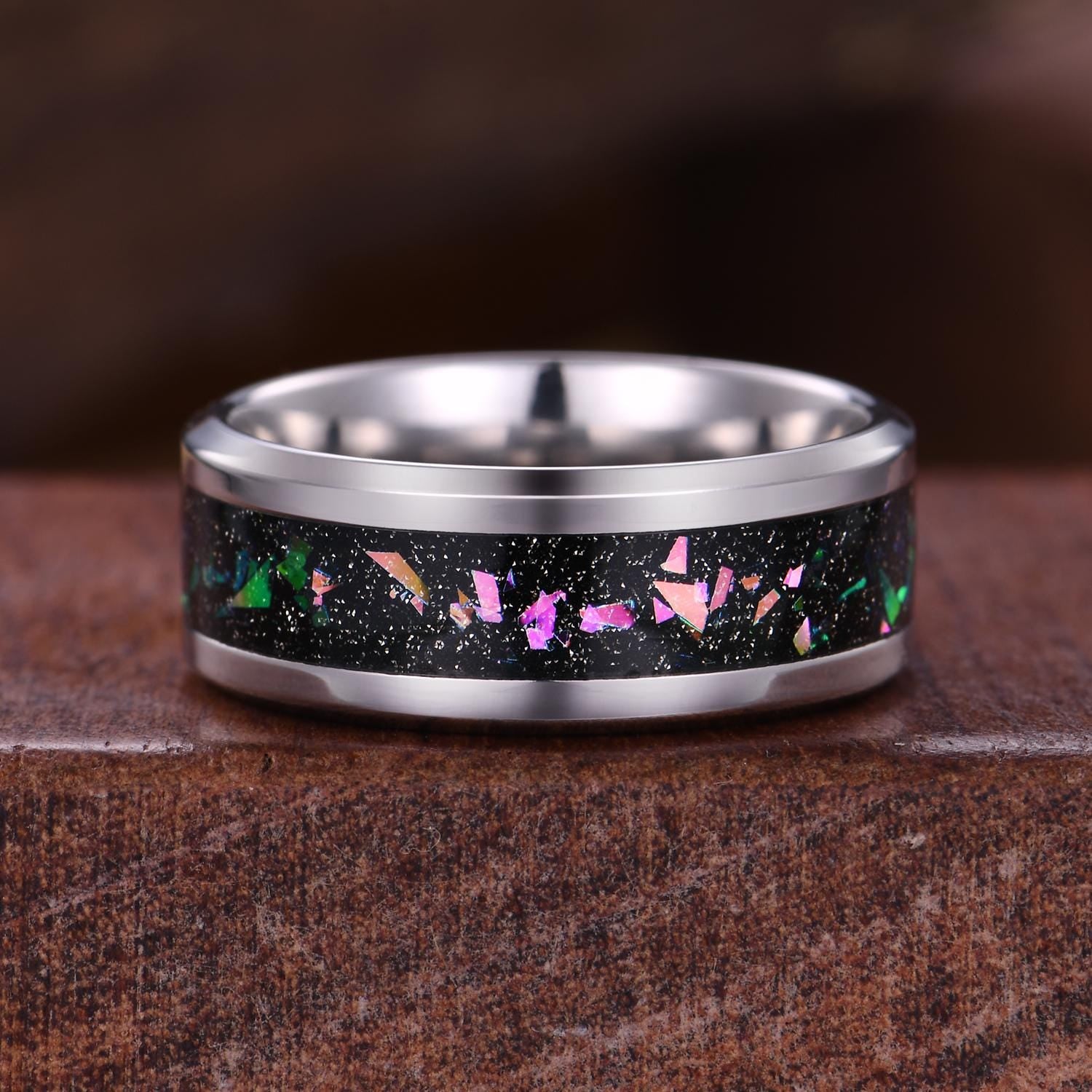 ►His ring is White Gold Tungsten Carbide with purple fire opal and meteorite inlay.