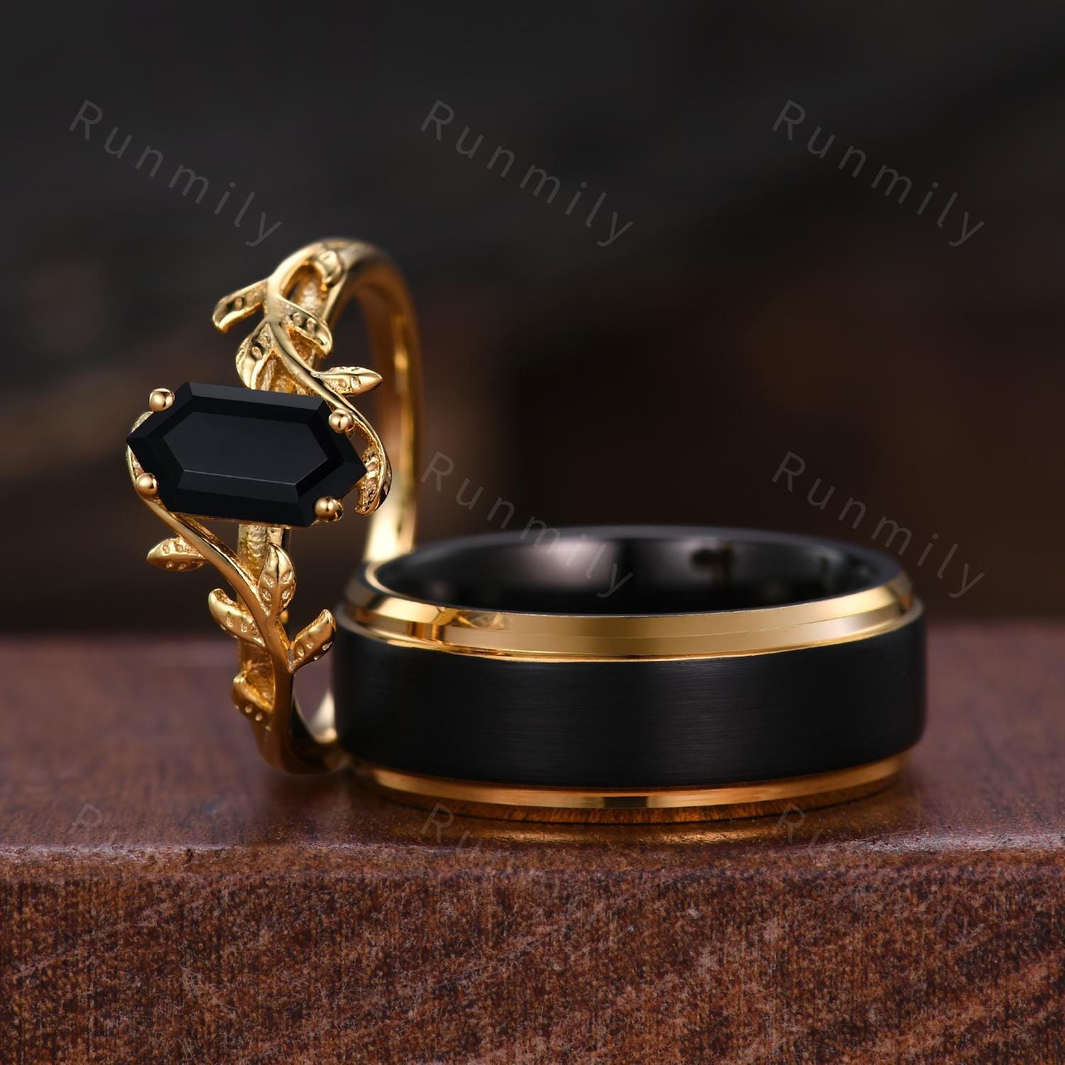 Twig Leaf Black Onyx Couples Ring Yellow Gold Matching Ring Set His And Hers Wedding Band Promise Ring For Men For Women Natural Black Onyx