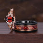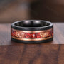 ►His ring is Black Tungsten Carbide with rose gold leaf and garnet inlay.