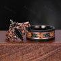 ►His ring is Black and Rose Gold Tungsten Carbide with meteorite and gold leaf.