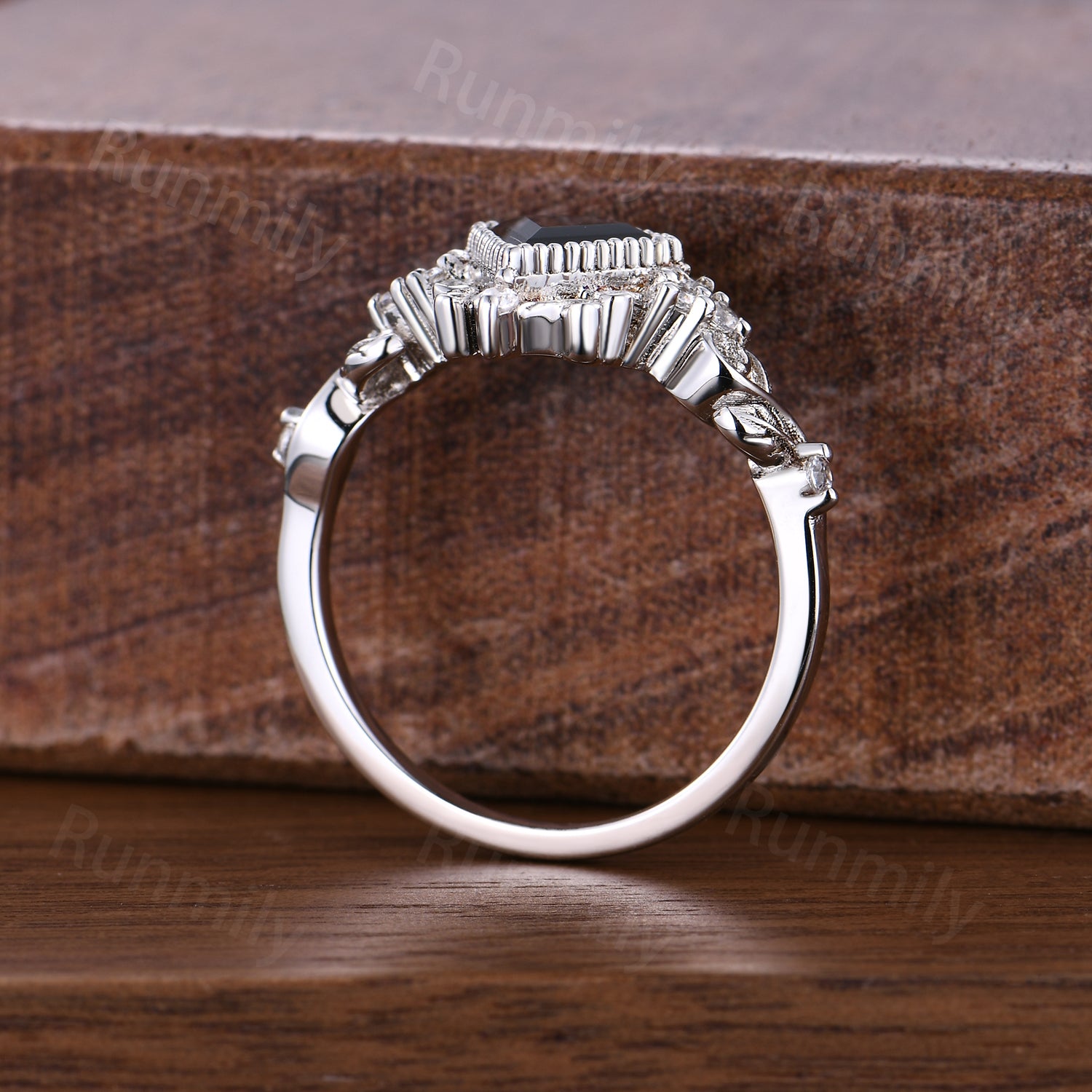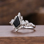 Vintage Kite Cut Black Onyx Engagement Ring, Sterling Silver Twig & Moissanite