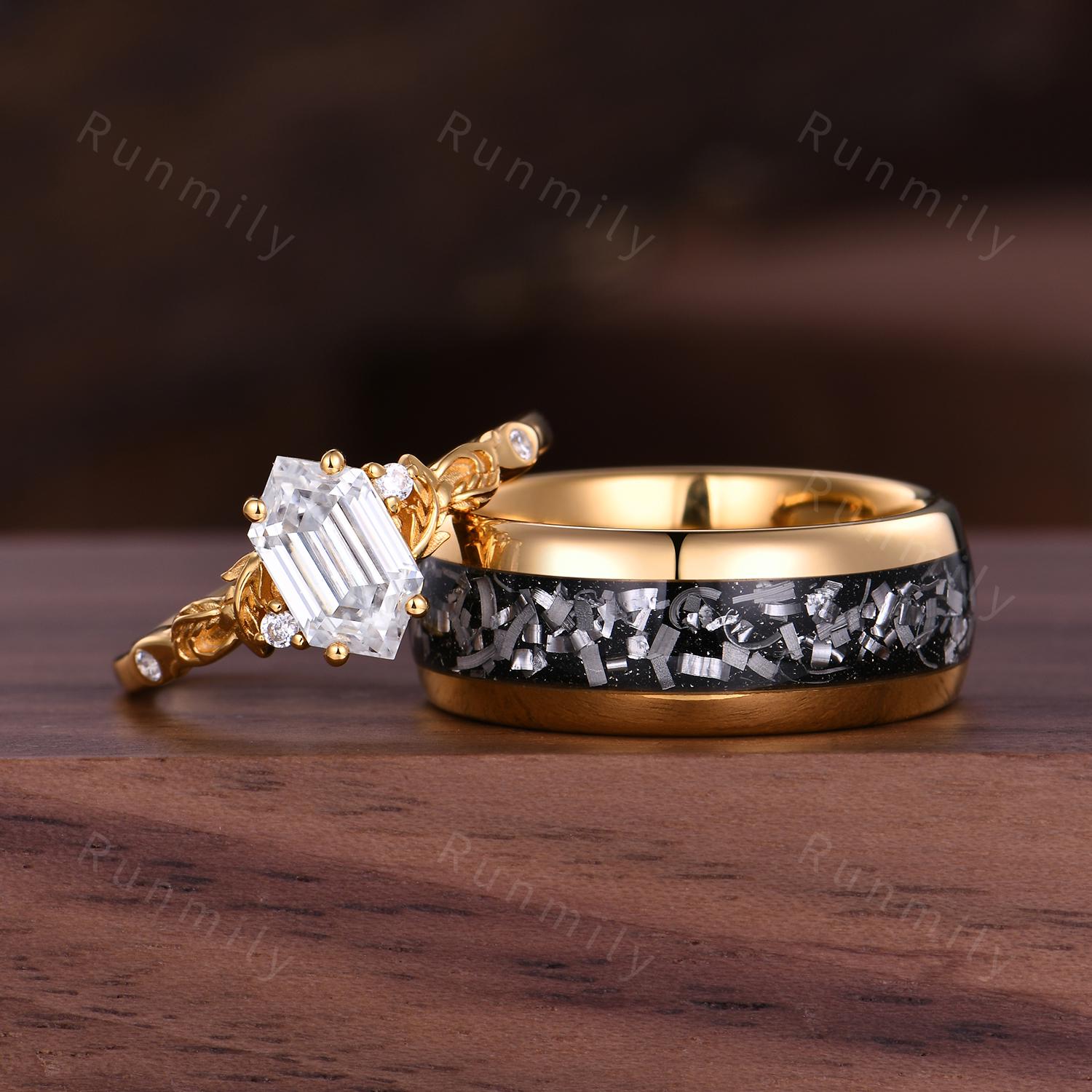 Vintage Moissanite Engagement Ring His and Hers Moissanite Couples Ring Set Yellow Gold Matching Promise Rings Alternative Engagement Ring