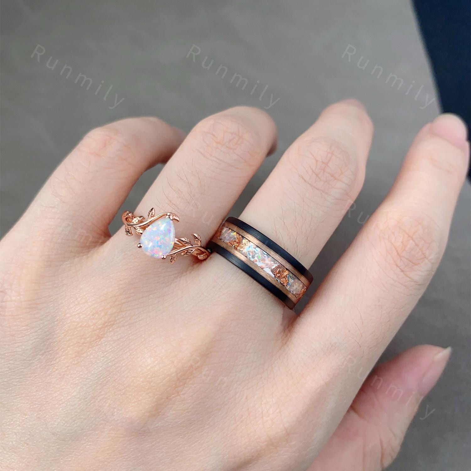►His ring is Rose gold Tungsten Carbide wite Opal and Gold Leaf inlay.